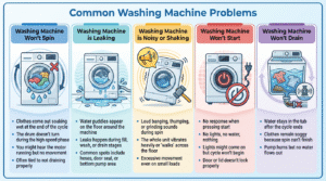 Top 5 common washing machine problems like won’t spin, leaking, noisy, won’t start, won’t drain. Easy DIY fixes to save time and money on repairs.